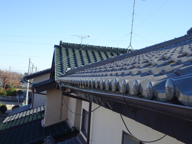 After「施工後の様子です。和瓦の重厚感に合わせたPanasonic製の雨樋が、ビシッと直線を描き、お住まいの美しさを引き立てます。」