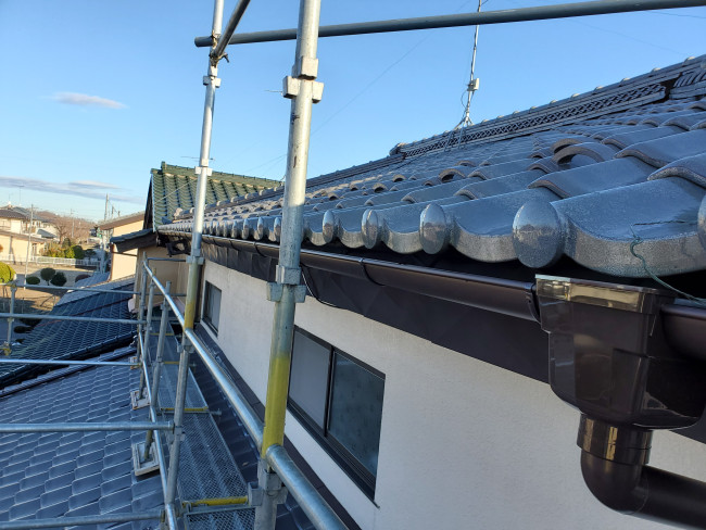 ・和風建築に馴染むデザイン: 立派な和瓦の屋根に合わせて、Panasonic製の耐久性に優れた雨樋を選定。重厚な建物の外観を損なわない落ち着いたカラーで仕上げました。・雪に強い施工: 以前よりも支持金具の強度を高め、今後の栃木の積雪にも耐えられるよう、細心の注意を払って設置しました。